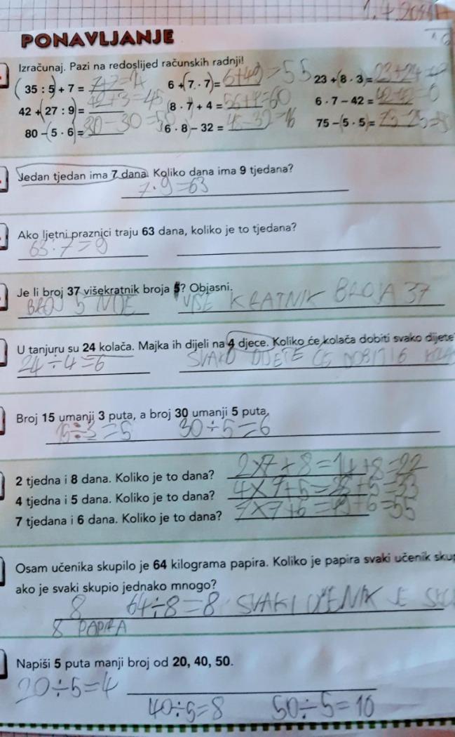 Prvoga dana nastave uživo vrijeme je da se podsjetimo što smo sve odradili na daljinu, od 12. travnja do 7. svibnja. Nešto je bilo lako, nešto je bilo teško, pomogli su učitelji, a još više roditelji. Pisali smo, čitali, računali, vježbali, vrtlarili, izrađivali, pekli, a učenici na smještaju proslavili su i dva rođendana.