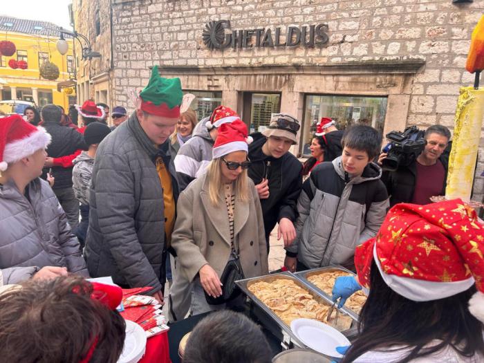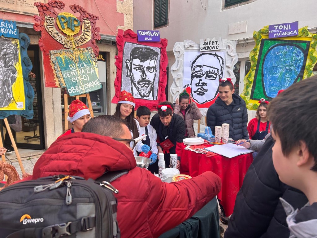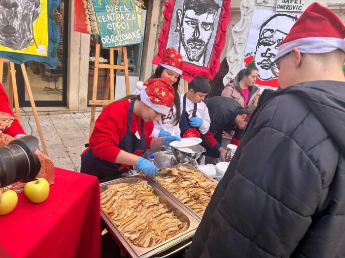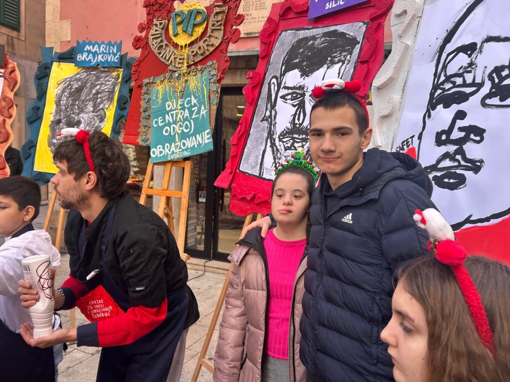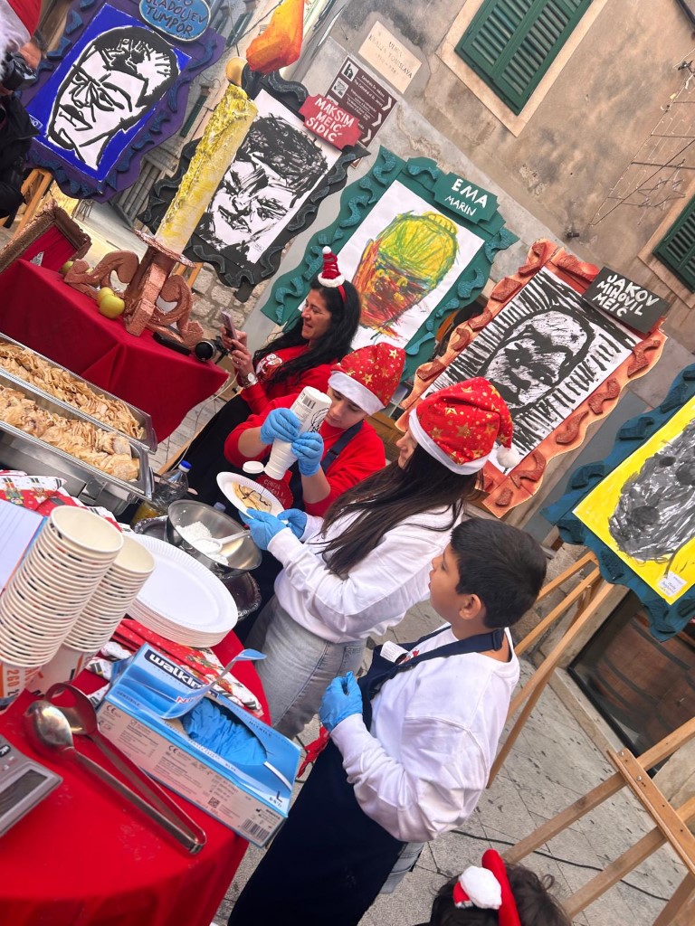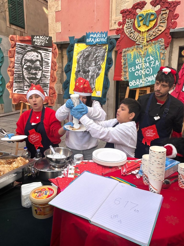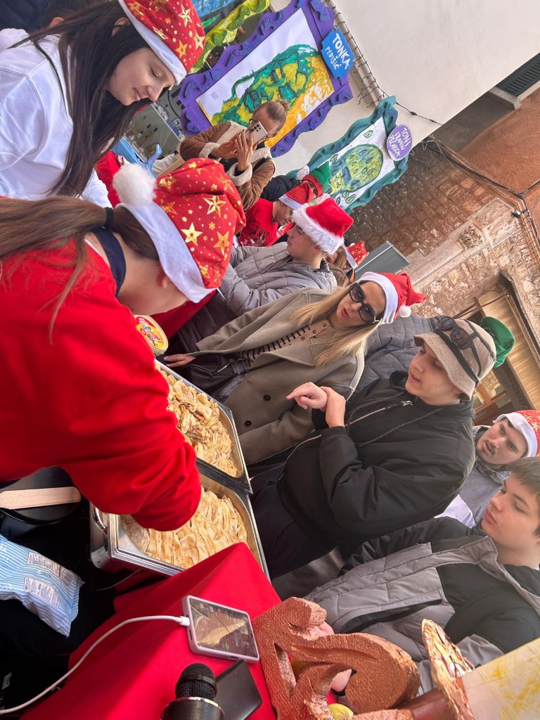Volimo primati goste kod nas doma, ali u petak 19. prosinca odlučili smo ugostiti znane i neznane u samome centru grada. Između Kalelarge i Masne ulice izložili smo portrete nastale na satovima Likovne kulture kod učitelja Zvonimira Vile, a zajedno s njima izložili smo i svježe pečene palačinke, kao i topli čaj, sve to uz božićne pjesme. Tako smo pokušali postići da nas doživite svim osjetilima u našem i vašem gradu. Koliko smo čuli - u tome smo i uspjeli, zato se nadamo da nam ovaj prvi put neće biti i posljednji!